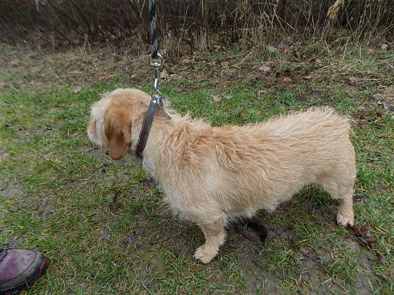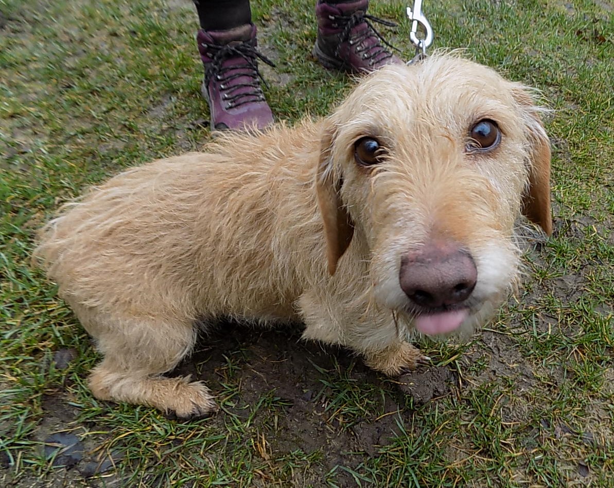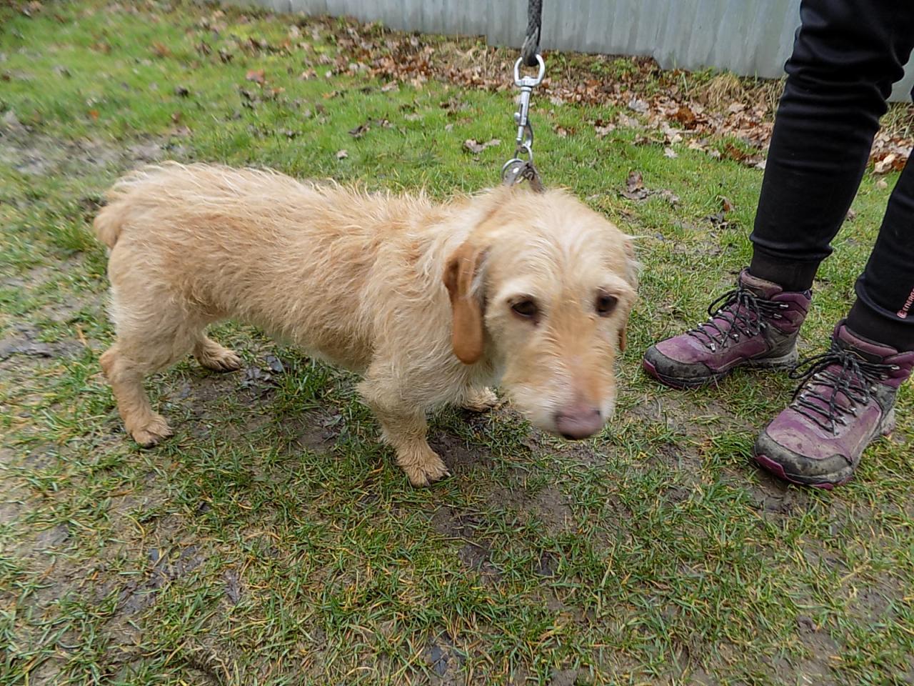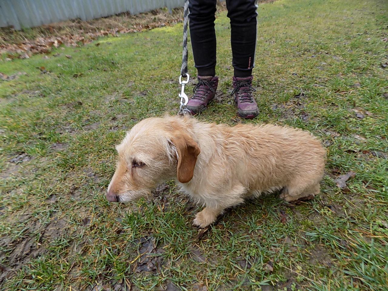 V době přijetí asi šestiletý kříženec jezevčíka byl přivezen z Radnic po zemřelém majiteli. Váží 10 kg, čip neměl, je hodný, přítulný, ostatních psů si nevšímá. V současné době je po karanténě. Č. čipu 203164000156285, je hodný, milý, čistotný, vhodný i do bytu.
